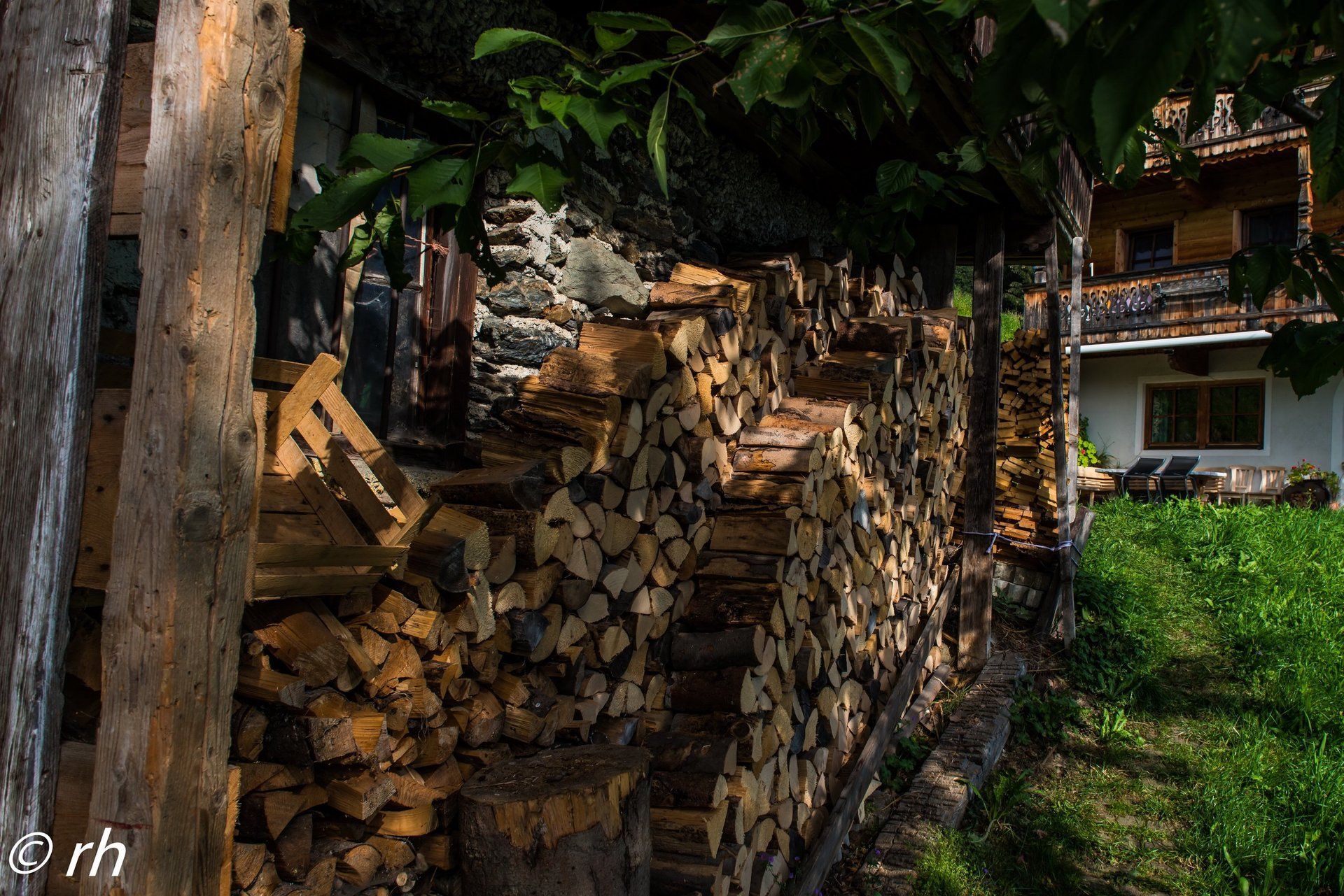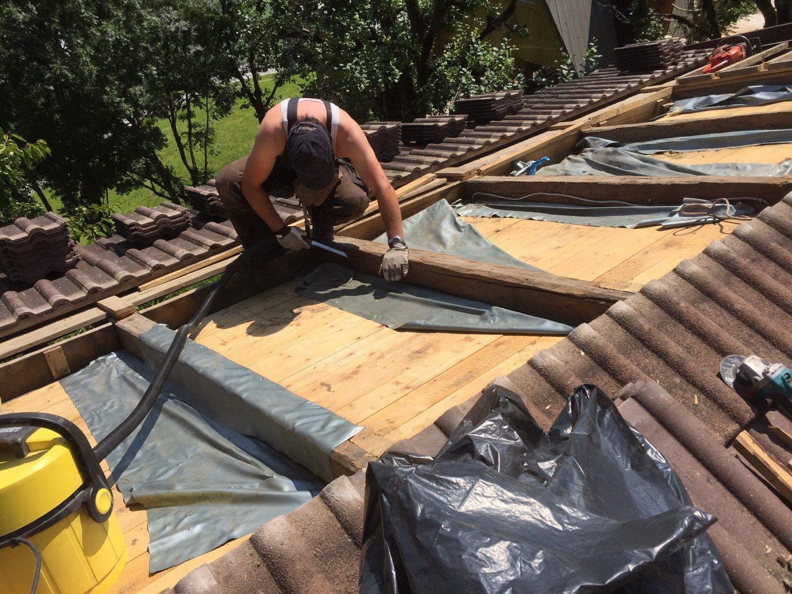 Die Bergseite des Daches muss noch bearbeitet werden. Da hier das Dach flächenmäßig viel größer und auch schon eingeschlagen ist, bedeutet dies wesentlich mehr Arbeitsaufwand als an der Hangseite.